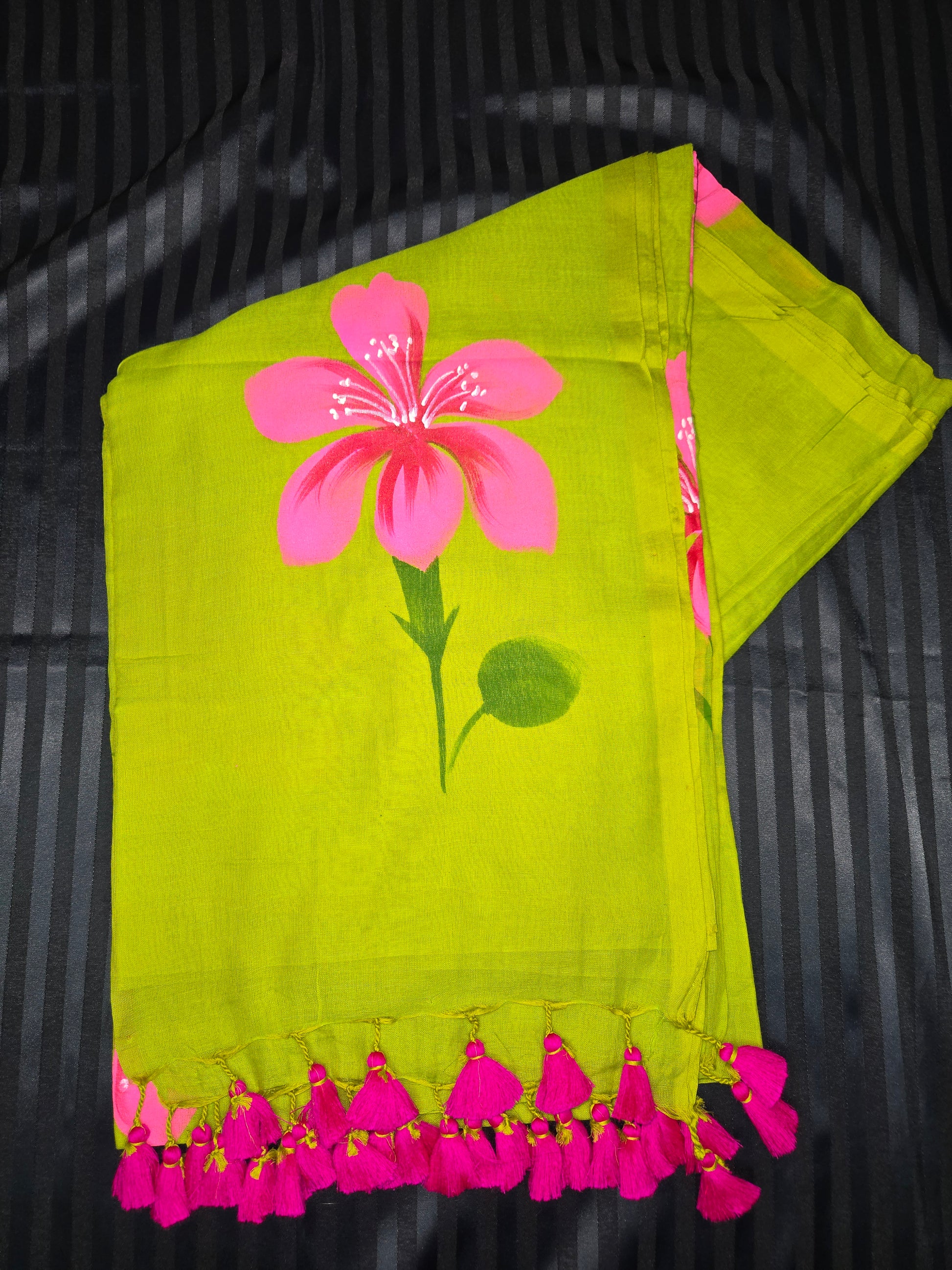 Expertly hand-painted and made with lightweight mulcotton material, the Lily saree provides effortless draping and a unique, elegant look. Perfect for any occasion, this saree combines beauty and comfort for a truly luxurious experience.