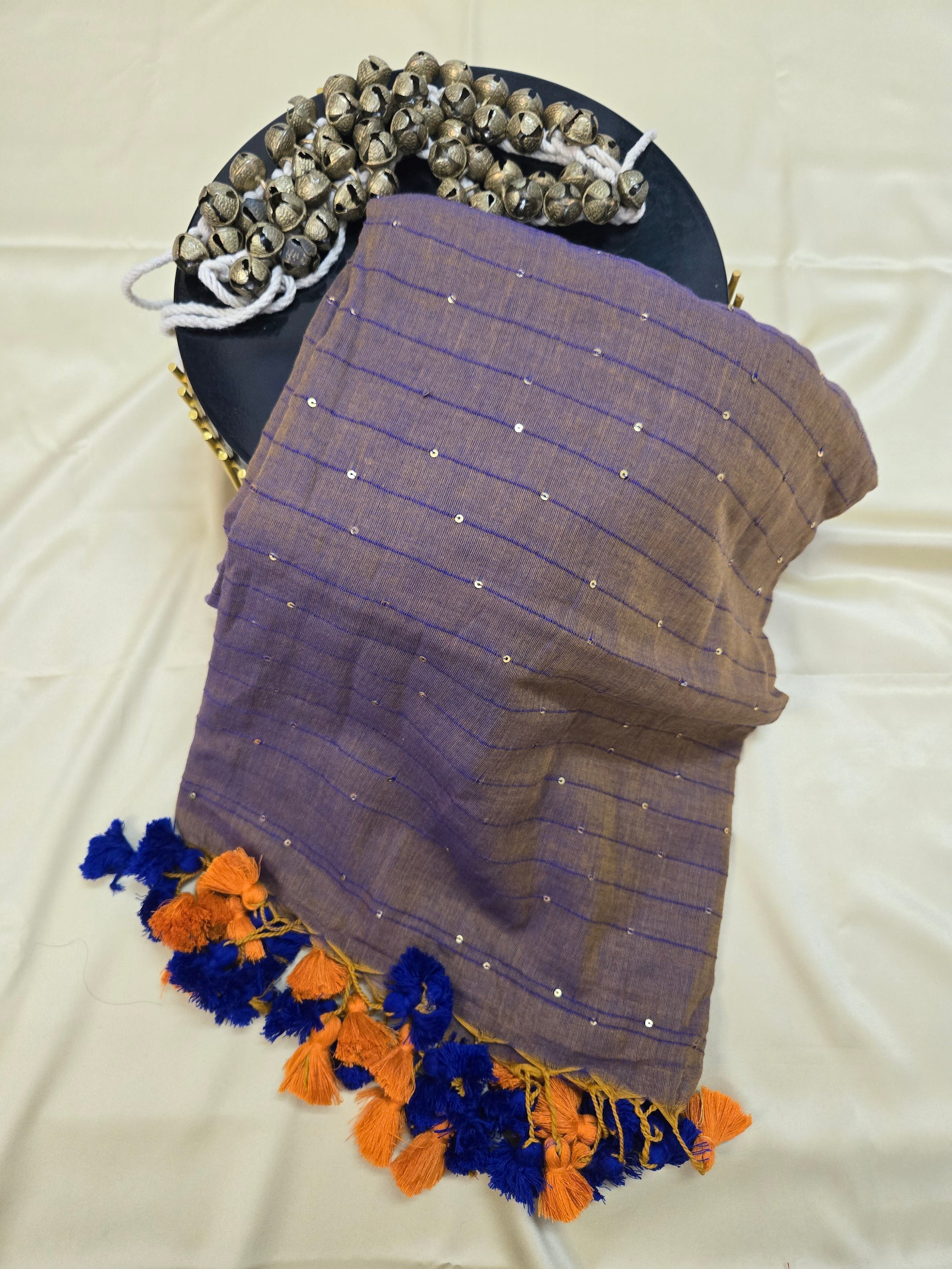 Indulge in the luxurious feel of our Mul Cotton saree, adorned with delicate sequin work throughout the fabric that stays intact beautifully. Its soft, breathable material drapes elegantly for everyday wear or special occasions. Finished with long tassels for a graceful touch. Expertly crafted for your pleasure.